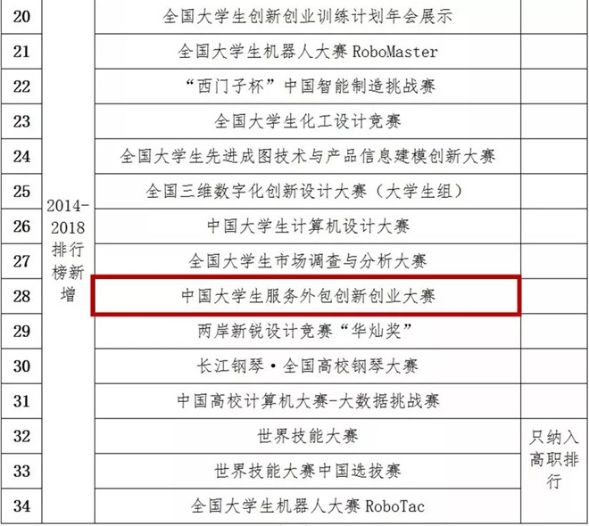 由我校参与承办的中国大学生服务外包创新创业大赛跻身评估排行榜的新增竞赛项目