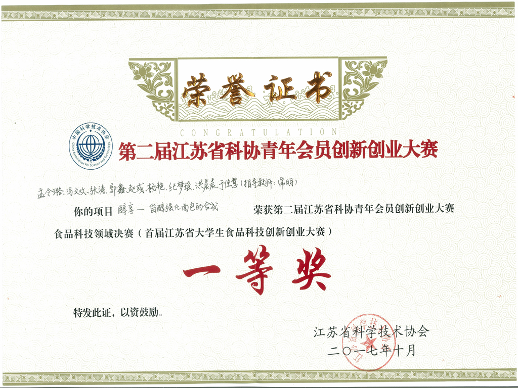2017年10月15日,第二届江苏省科协青年会员创新创业大赛暨首届江苏省大学生食品创新创业大赛决赛在南京工业大学江浦校区江浦报告厅闭幕。江南大学食品学院师生不负众望,李兆丰教授指导的王颖兰团队作品《慢消化淀粉的双酶法制备及功能性评价》和常明副教授指导的孟令璐团队作品《醇享——甾醇强化面包的合成》均获得大赛一等奖。